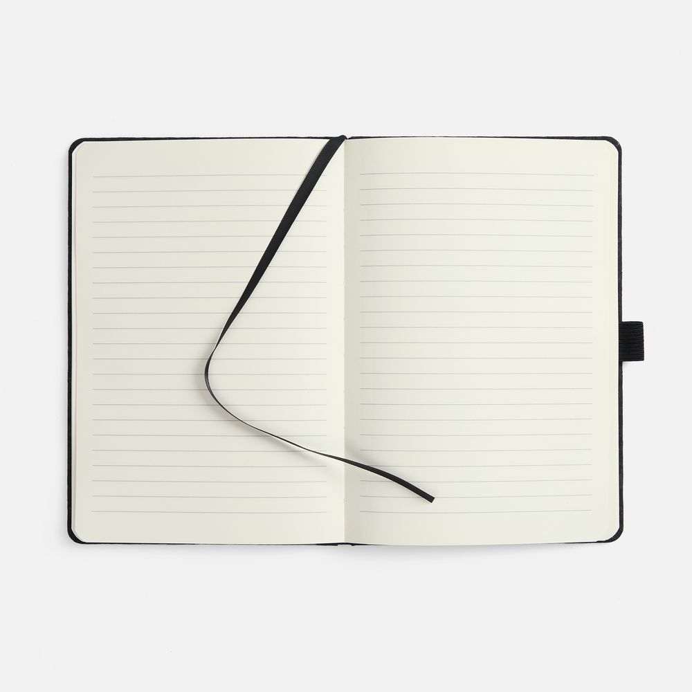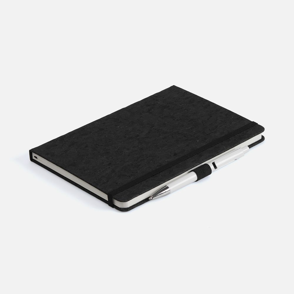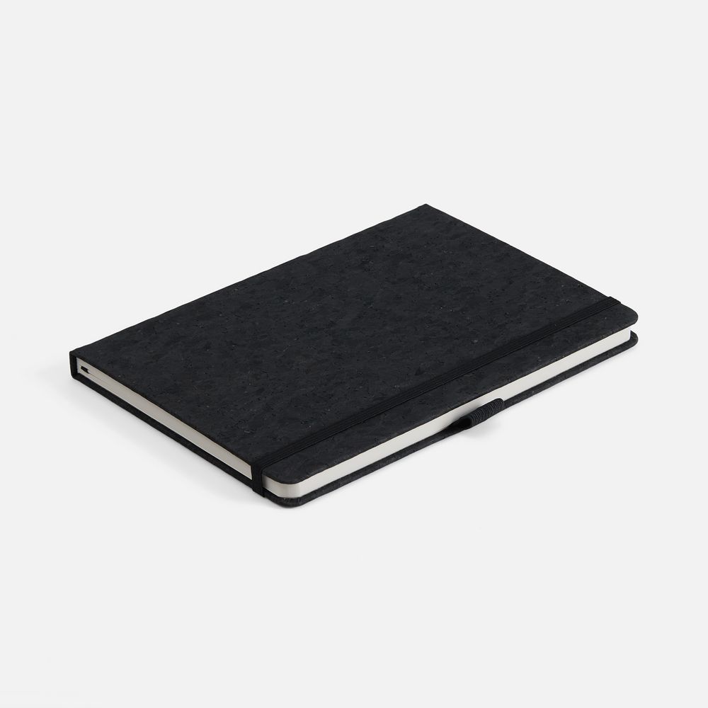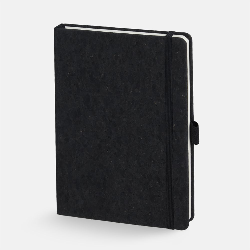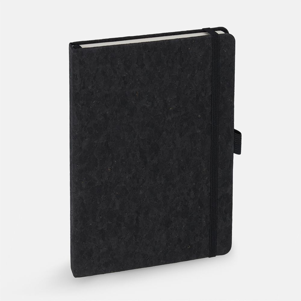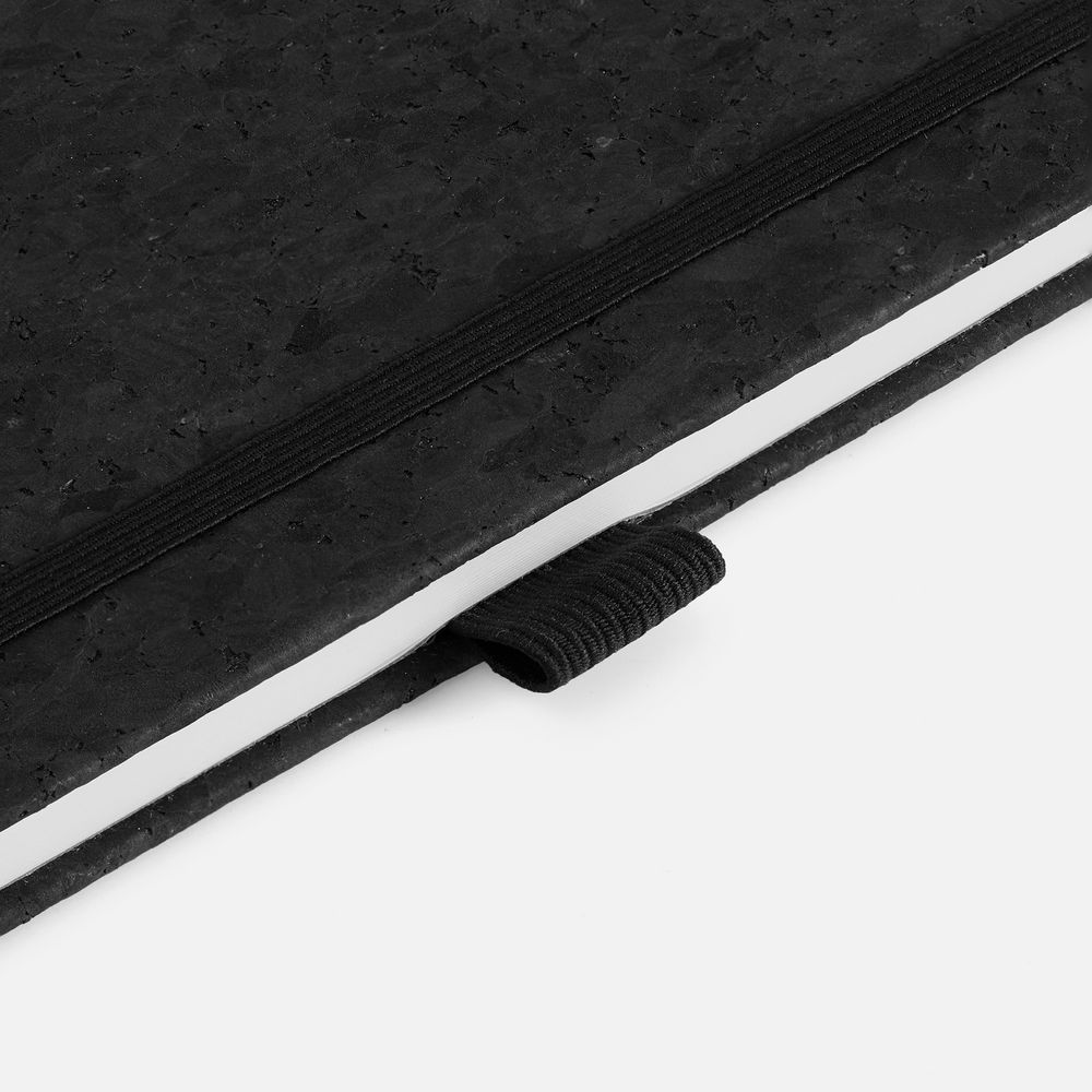 Блокнот с твердой обложкой из из натуральной окрашенной пробки, дополнен петлей-резинкой для ручки, ляссе и резинкой в цвет обложки.