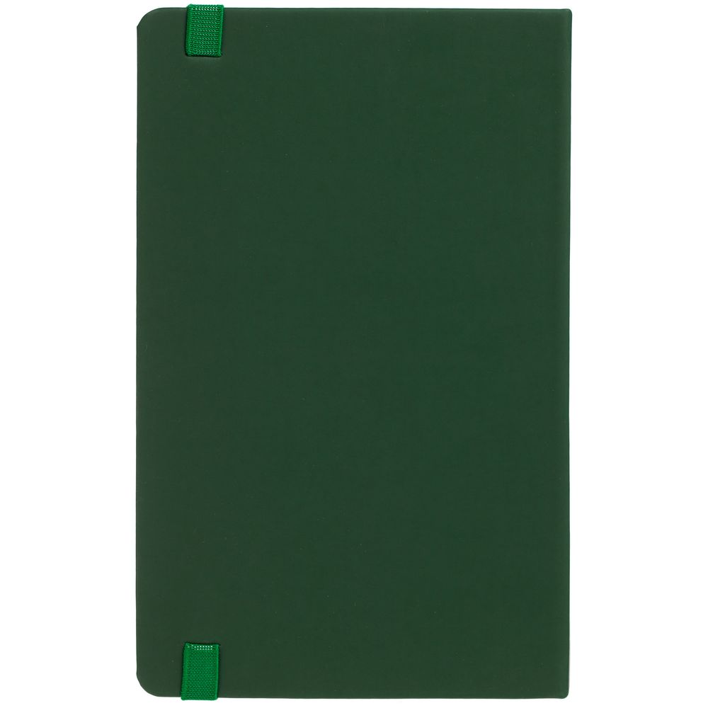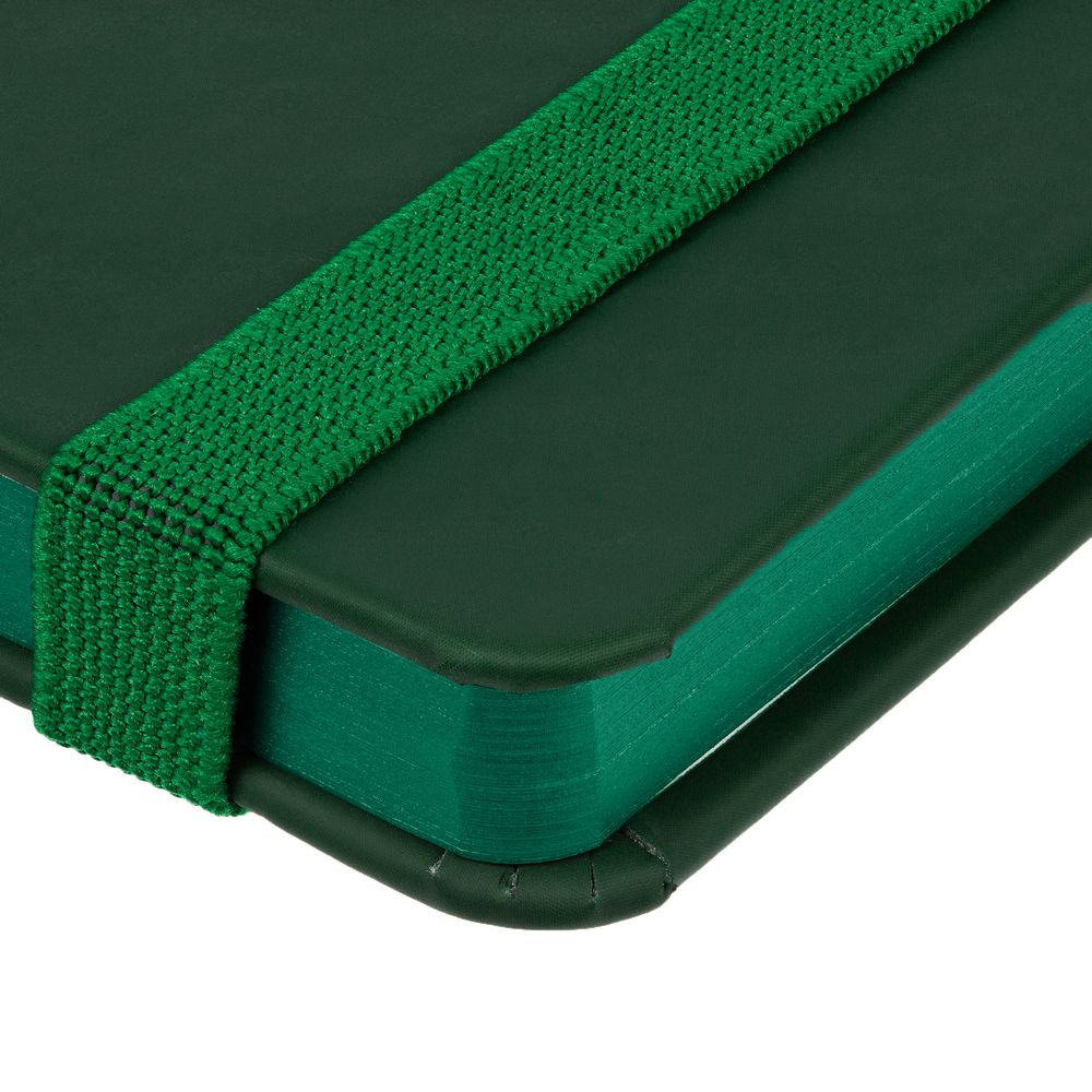 Блокнот в твердой обложке, выполнен из материала Soft Touch, зеленый FF, дополнен резинкой и ляссе в цвет обложки.