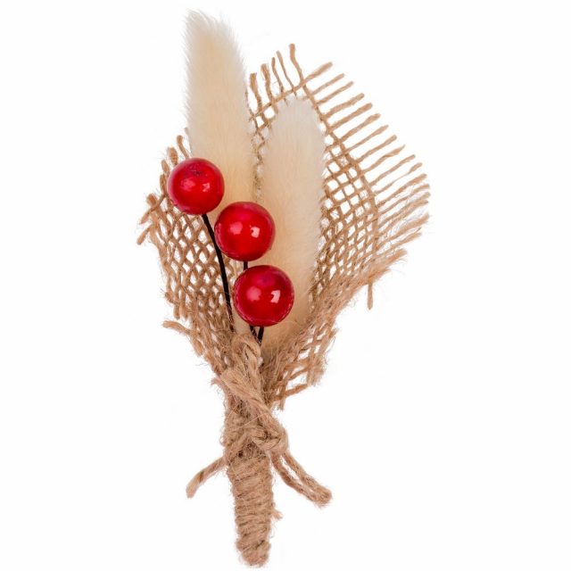 Декоративный букет из 2 веточек белого ларгуса и 3 искусственных ягодок красного цветаобернут в джутовую мешковину и перевязан джутовым шпагатом.