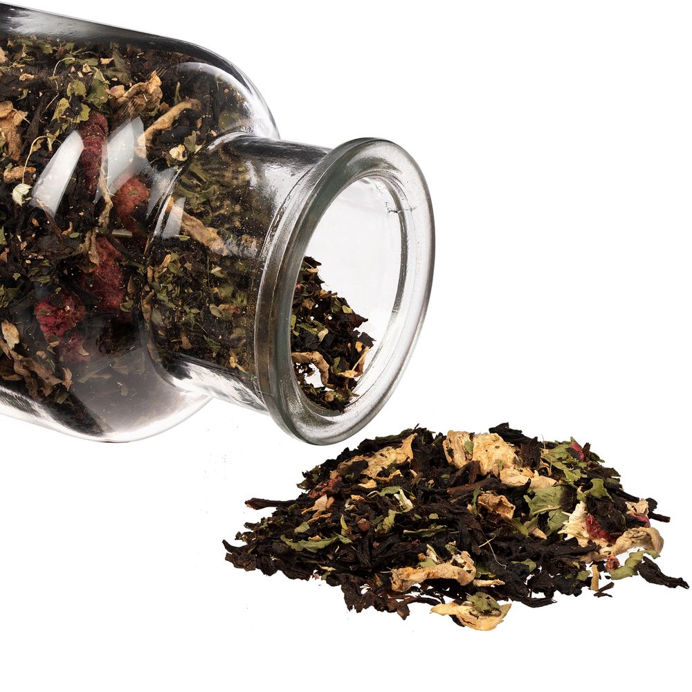 Состав: чай черный с имбирем и соком имбиря (чай черный байховый крупнолистовой, кусочки имбиря, сок имбиря), мята сушеная, малина сублимированная, ароматизатор натуральный «Малина».
