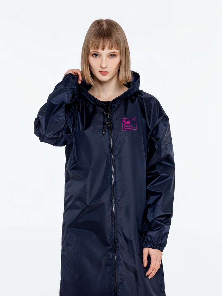 Плащ-дождевик из ткани таффета на молнии с капюшоном. Складывается в мешочек — удобно брать с собой.