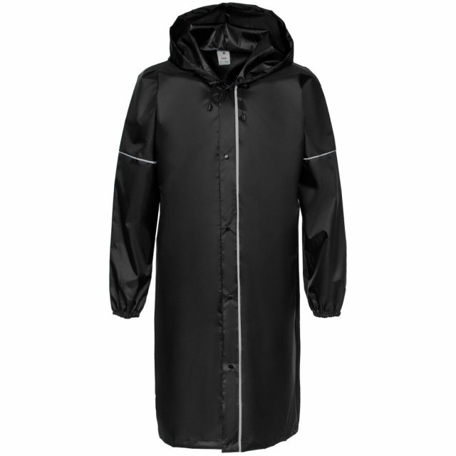 Плащ-дождевик из ткани оксфорд на кнопках с капюшоном. Световозвращающие элементы на рукавах и планке позволяют быть замеченным в темное время суток.