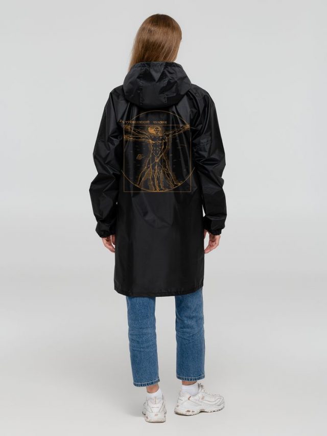 Ветреная погода может внести свои коррективы даже в идеальную симметрию! Сильный порыв — и человек с картины Леонардо да Винчи стал ВЕТРОвианским. Главное — успеть удержать фиговый листочек на нужном месте.Плащ-дождевик из ткани таффета на молнии с капюшоном. Складывается в мешочек — удобно брать с собой.
