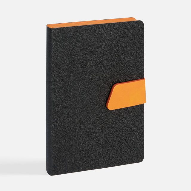 Ежедневник с гибкой обложкой, выполнен из материала La Fite, черный АА и Nubuck Touch, оранжевый, дополнен оранжевым ляссе и хлястиком на кнопке.