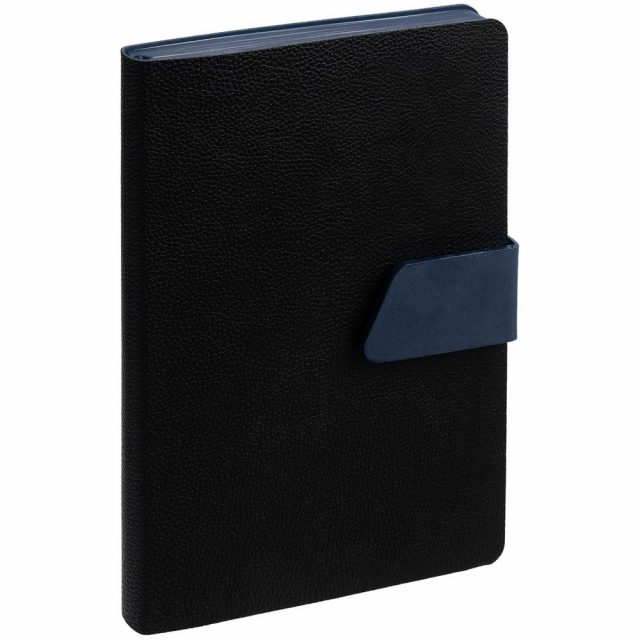 Ежедневник с гибкой обложкой, выполнен из материала La Fite, черный АА и Nubuck, темно-синий ХХ, дополнен синим ляссе и хлястиком на кнопке.