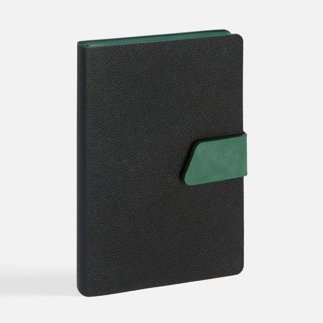 Ежедневник с гибкой обложкой, выполнен из материала La Fite, черный АА и NubuckTouch, зелёный, дополнен зеленым ляссе и хлястиком на кнопке.