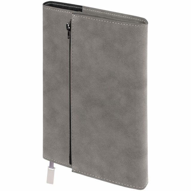 Ежедневник в гибкой суперобложке c карманом на молнии, выполнен из материала Nubuck, серый СС. Дополнен капталом и металлической шильдой на ляссе серого цвета.