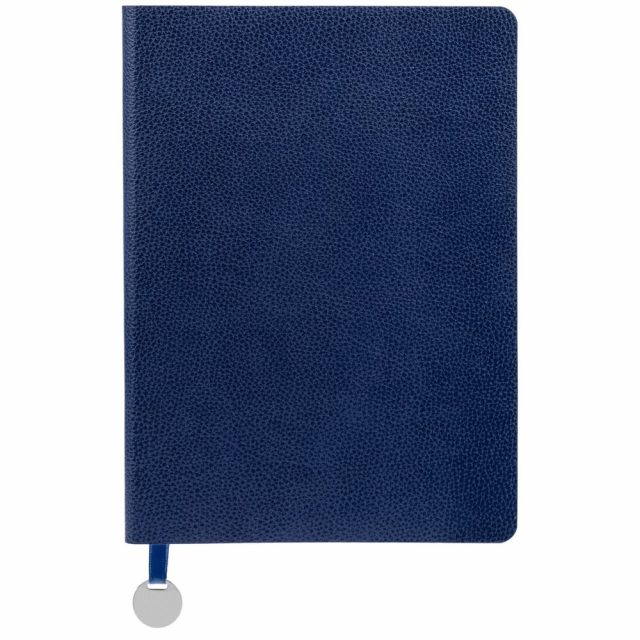 Ежедневник с гибкой обложкой, выполнен из материал La Fite, синий НН, дополнен ляссе в цвет обложки с металлическим шильдом.