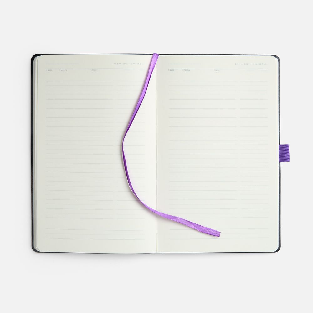 Ежедневник с гибкой обложкой, выполнен из материала Espresso, дополнен цветными ляссе и петлей-резинкой для ручки.