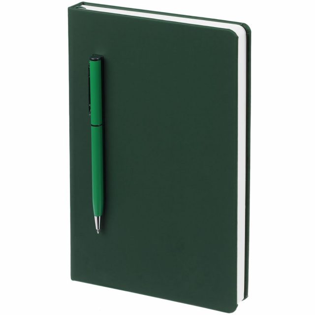 Ежедневник в твердой обложке, выполненной из материала Soft Touch, зеленый FF, дополнен цветным ляссе и магнитом, удерживающим ручку.
