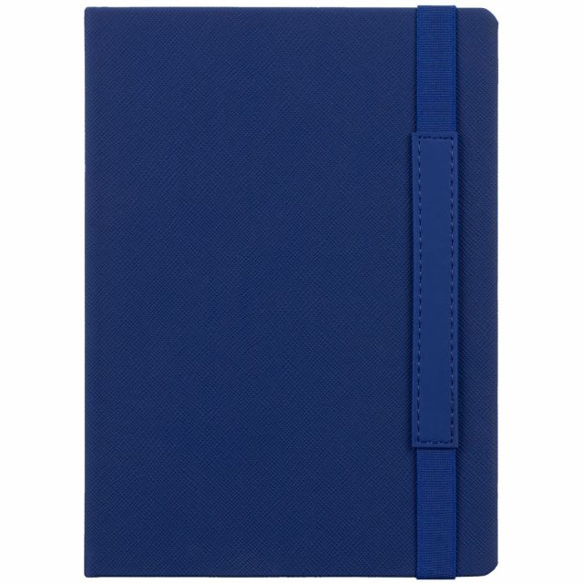 Ежедневник с твердой обложкой, выполнен из материала Nice Touch, синий, дополнен резинкой с лейблом из материала Soft Touch Ultra и ляссе в цвет обложки.