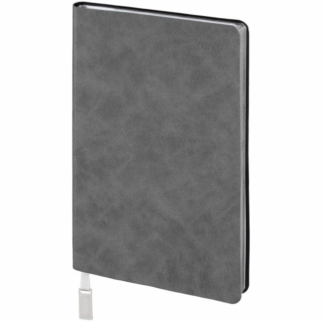 Ежедневник с гибкой обложкой, выполнен из материала Petrus, серый СС, дополнен серым ляссе с металлическим шильдиком.