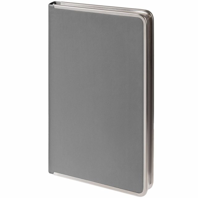 Изящный ежедневник с зауженным блоком и стильными деталями — металлической окантовкой на обложке и металлизированным обрезом.