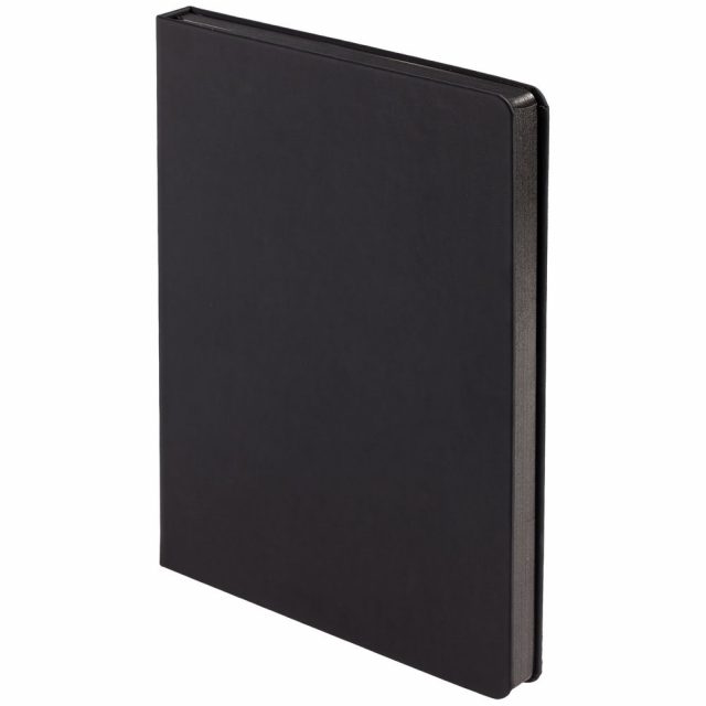 Ежедневник с твердой обложкой и тонированным обрезом, выполнен из материала Soft Touch, черный АА, дополнен ляссе в цвет обложки.