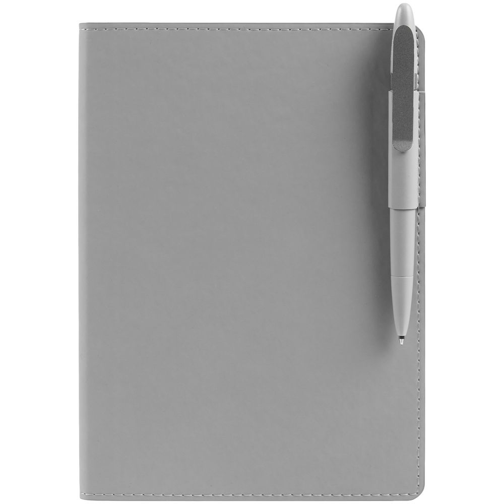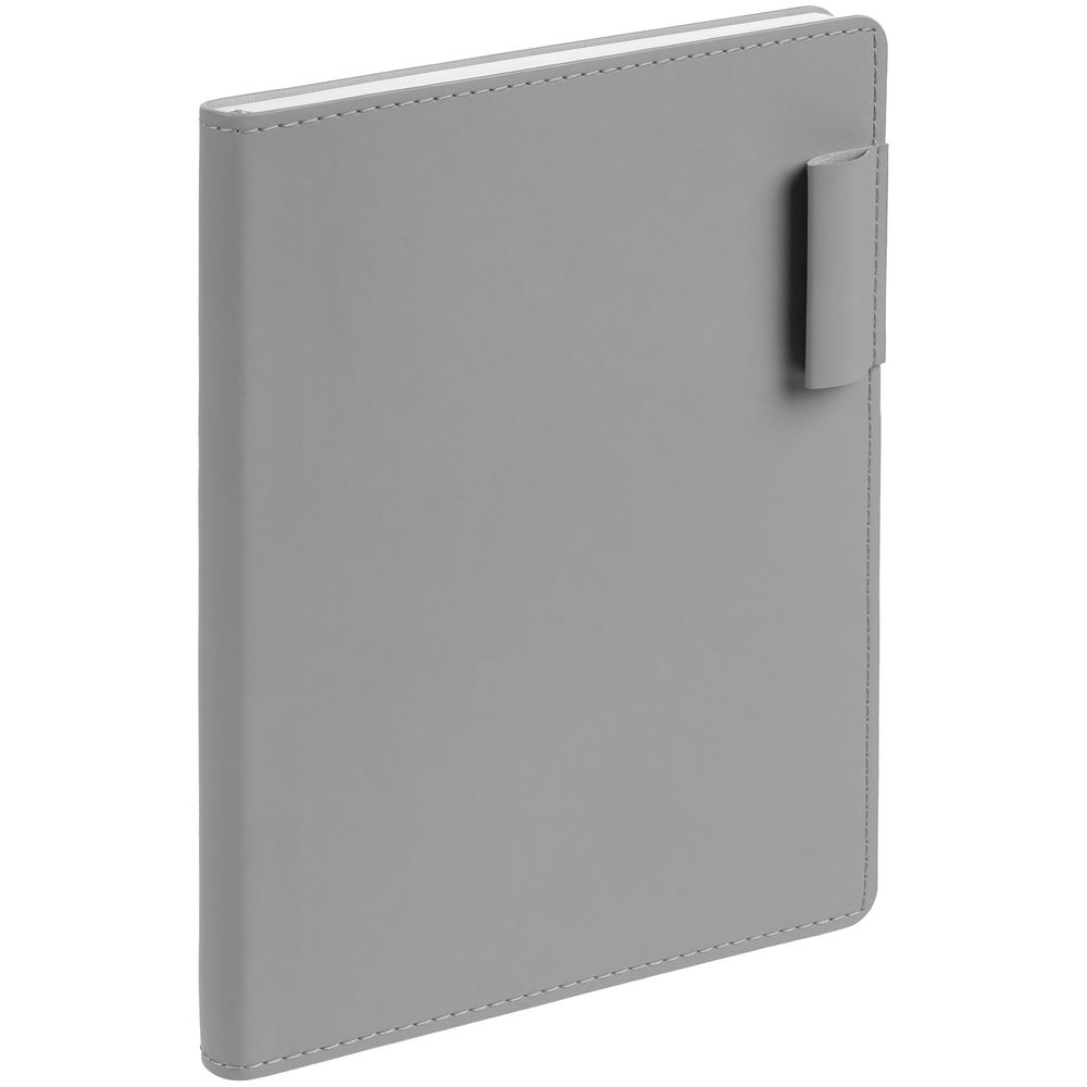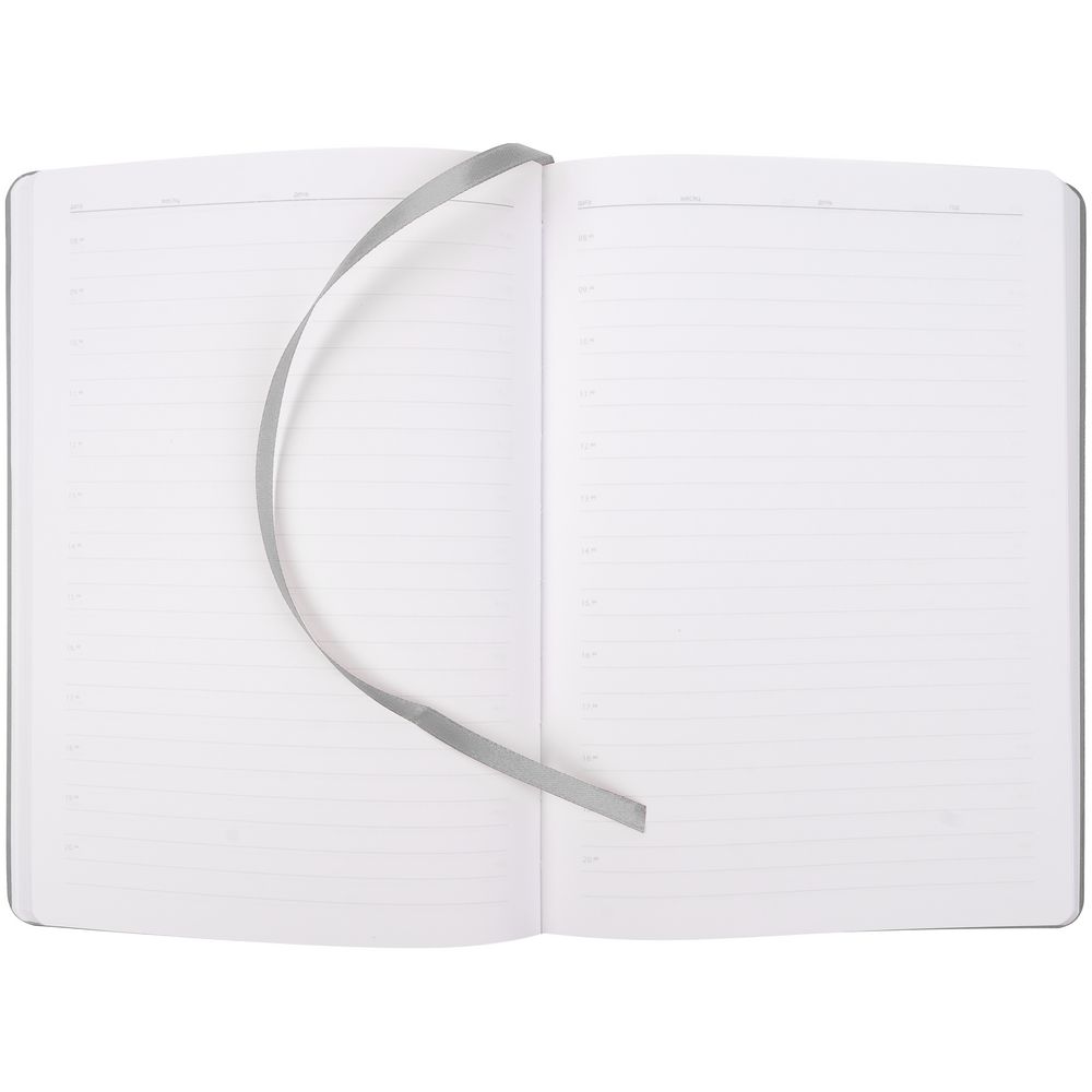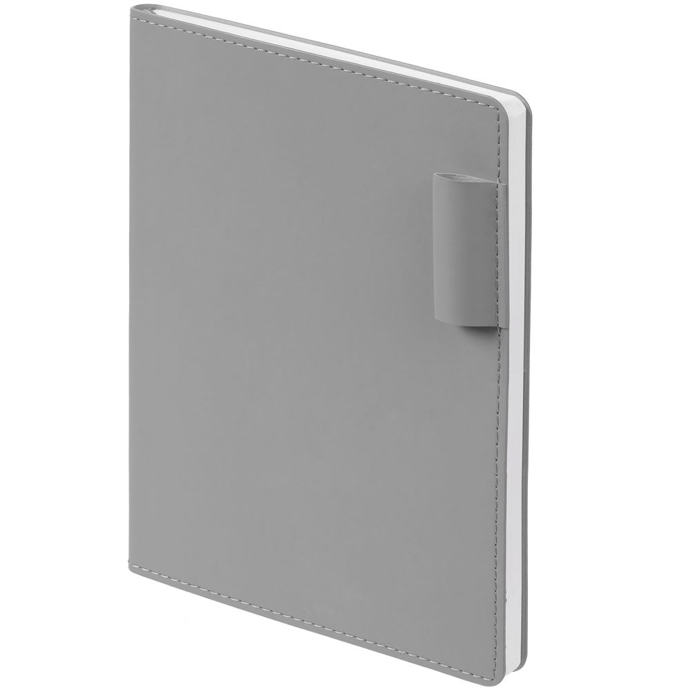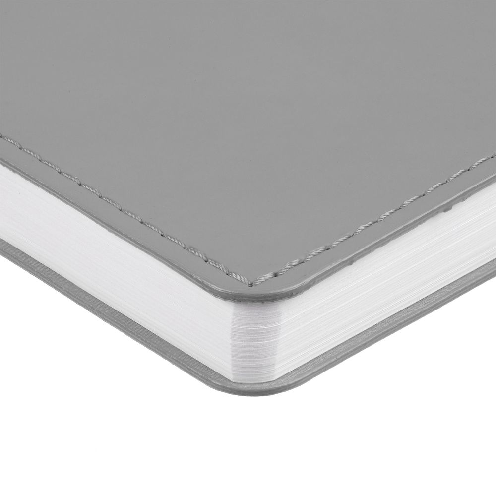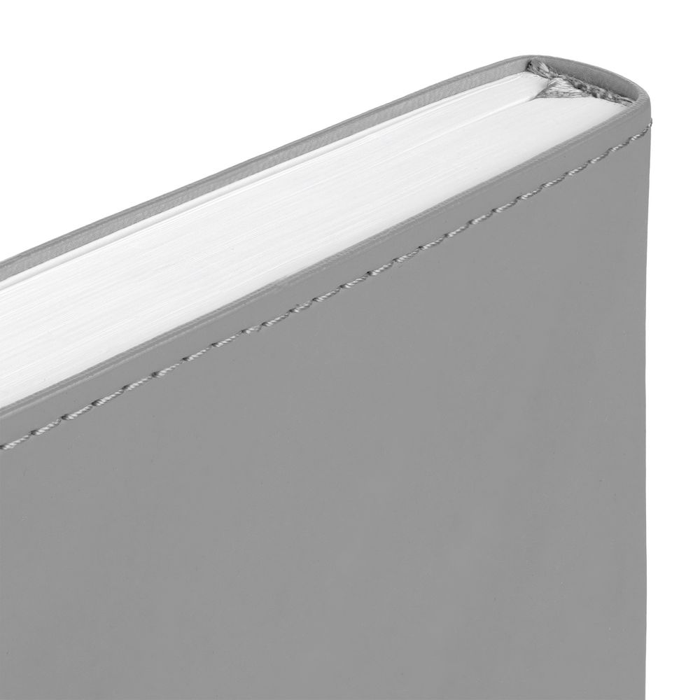 Ежедневник с гибкой обложкой из материала Soft Touch, серый СС и Latte, серый (внутренний материал), дополнен петелькой для ручки из покровного материала, капталом, ляссе и закрашенным срезом обложки в цвет материала.