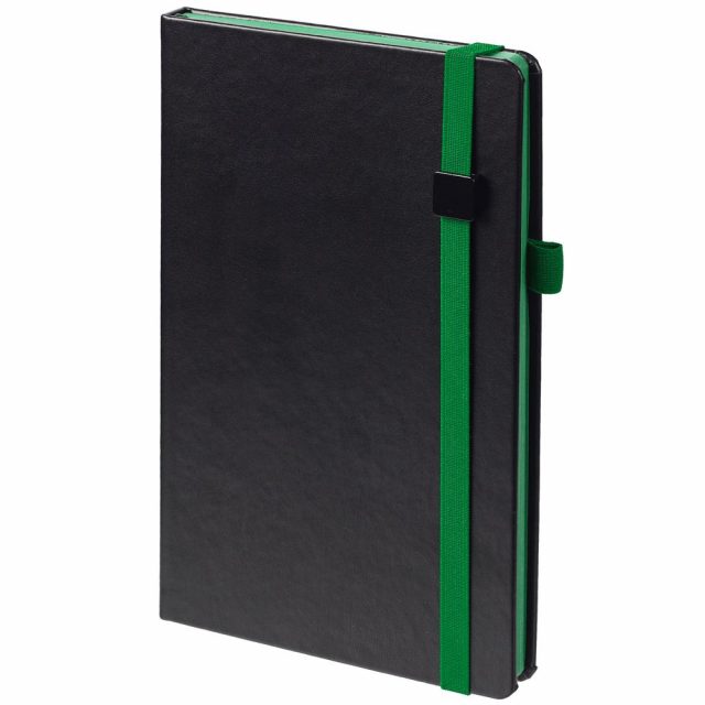 Ежедневник с полутвердой обложкой, выполнен из материала Waltz, черный АА, дополнен зеленой резинкой с металлическим шильдом и ляссе.
