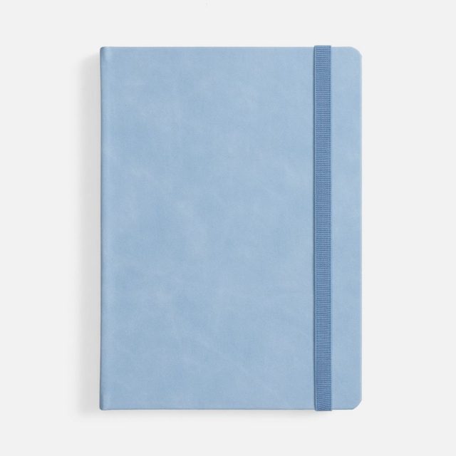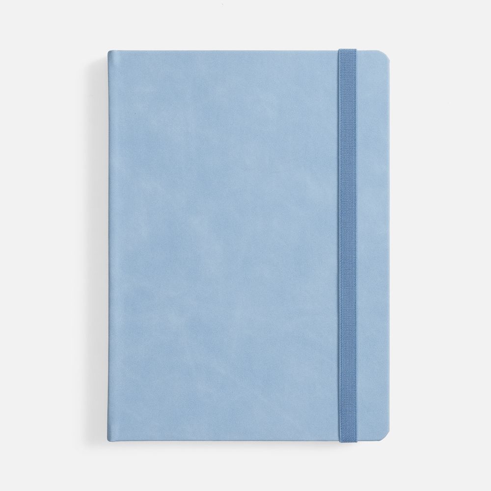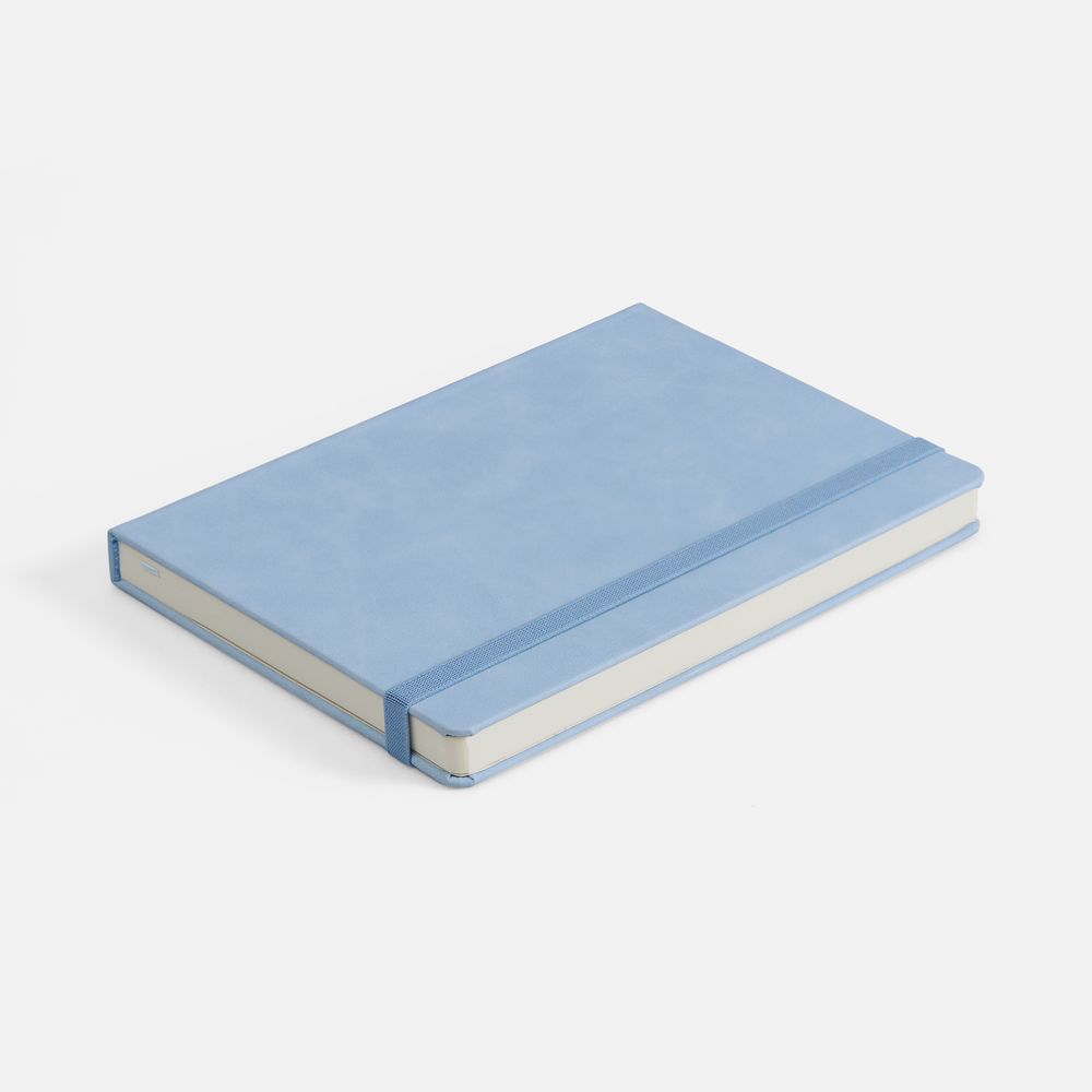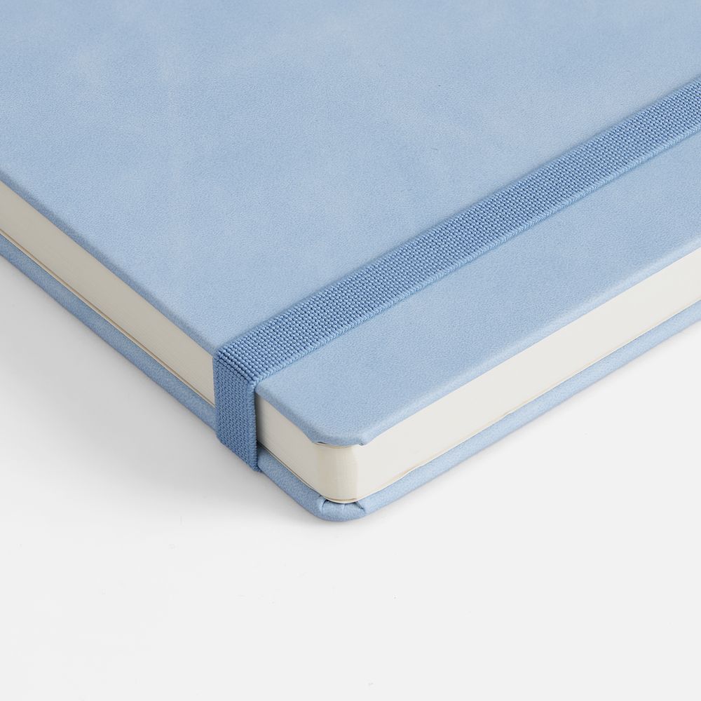 Ежедневник с твердой обложкой, выполнен из материала Nubuck Touch, голубой JJ, дополнен ляссе светло-голубого цвета.