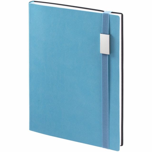 Ежедневник с гибкой обложкой, выполнен из материала Latte, голубой JJ, дополнен резинкой шириной 1 см с металлическим шильдом, капталом и ляссе голубого цвета.