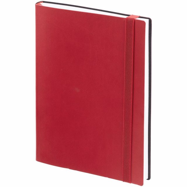 Ежедневник с гибкой обложкой выполнен из материала Latte, красный РР, и дополнен резинкой шириной 1 см, капталом и ляссе красного цвета.
