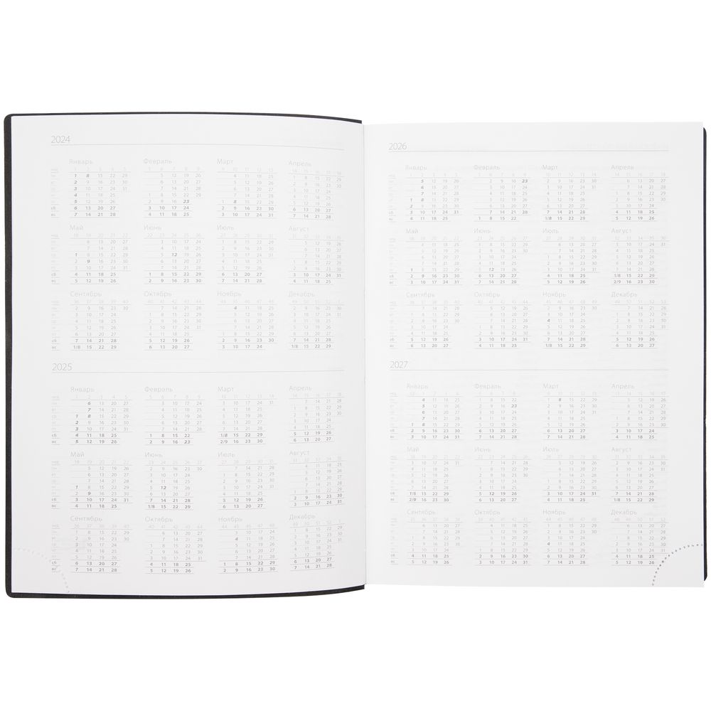 Ежедневник с гибкой обложкой, выполнен из материала Latte, темно-синий НН, дополнен резинкой шириной 1 см, капталом и ляссе темно-синего цвета.