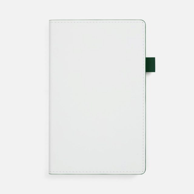 Гибкая обложка, материал обложки — Soft Touch, белый BB и Latte, зеленый FF; материал петли для ручки — Nice Touch, зеленый FF. Срез обложки окрашен в зеленый цвет.