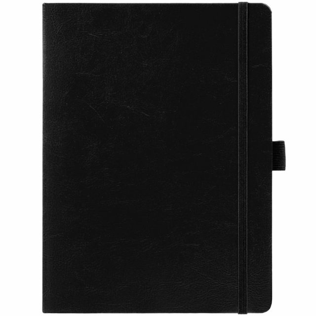 Еженедельник в твердой обложке выполнен из материала Nebraska, черный АА, дополнен резинкой, петлей для ручки и ляссе черного цвета.