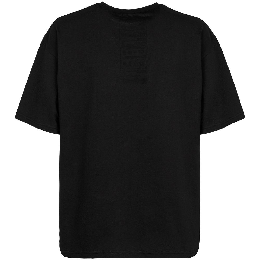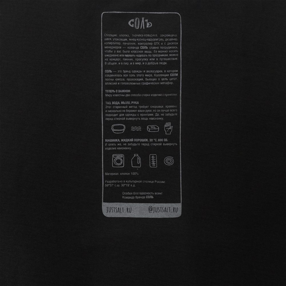 На изнаночной стороне футболки напечатан принт с информацией о бренде и инструкцией по уходу за изделием.