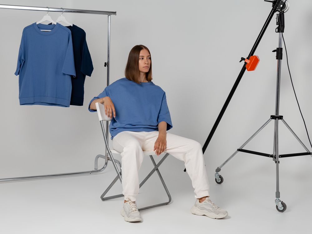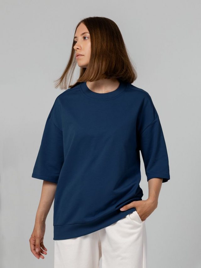 Футболка унисекс свободного кроя со спущенным плечом.