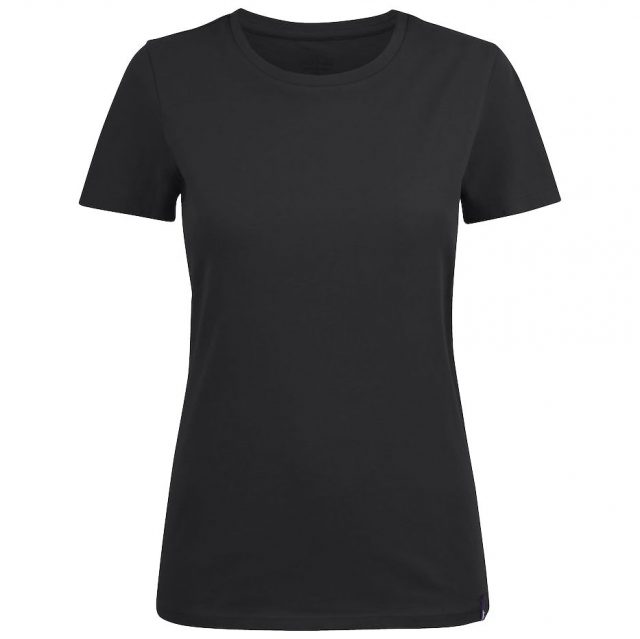 Женская футболка с круглым вырезом. Двухслойная резинка предохраняет воротник от деформации после стирки.