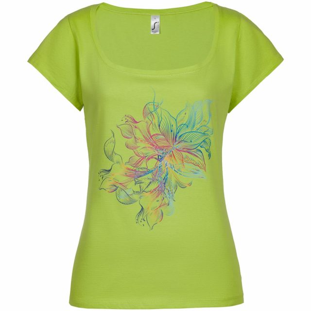 Футболка женственного приталенного силуэта с американской проймой и глубоким вырезом, отделанным обтачкой из джерси. Двойная прострочка на вороте спереди, на рукавах и по низу.