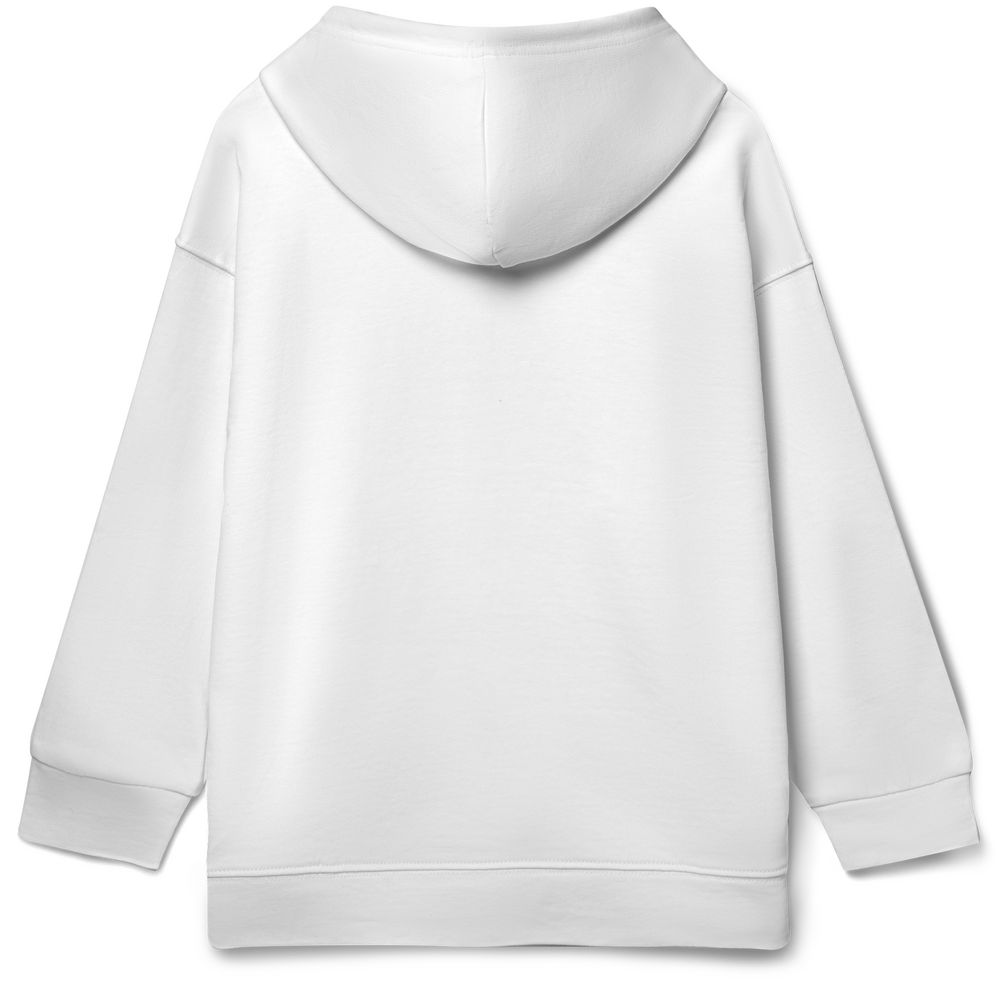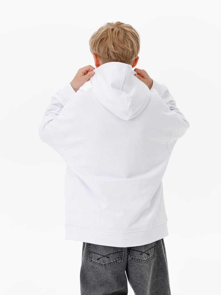 Детское худи оверсайз со спущенным плечом и карманом-кенгуру.