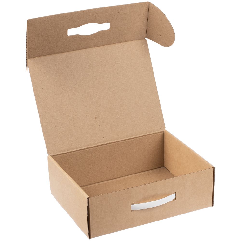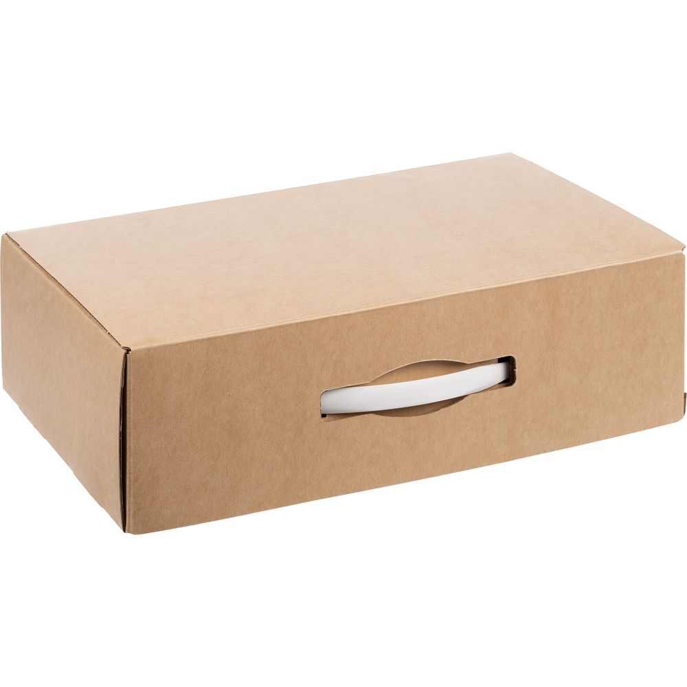 Самосборная коробка-шкатулка со вставной пластиковой ручкой.