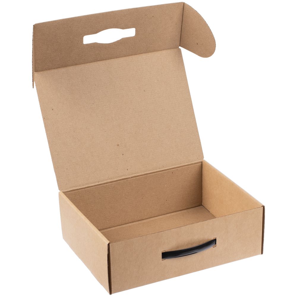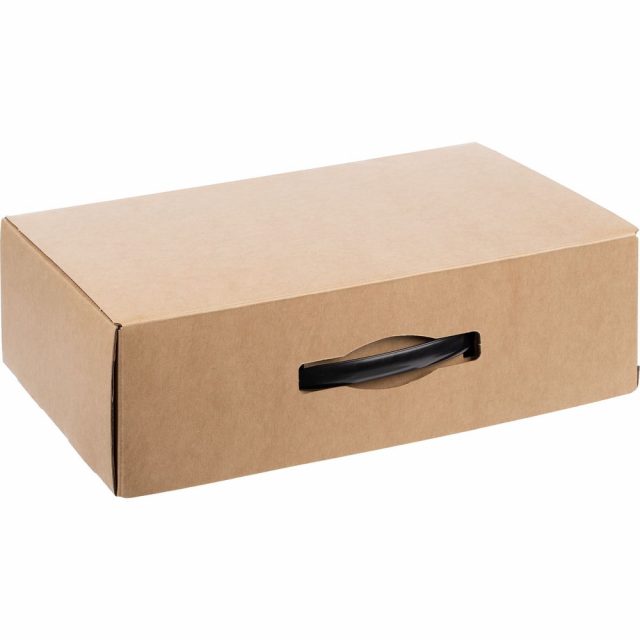 Самосборная коробка-шкатулка со вставной пластиковой ручкой.