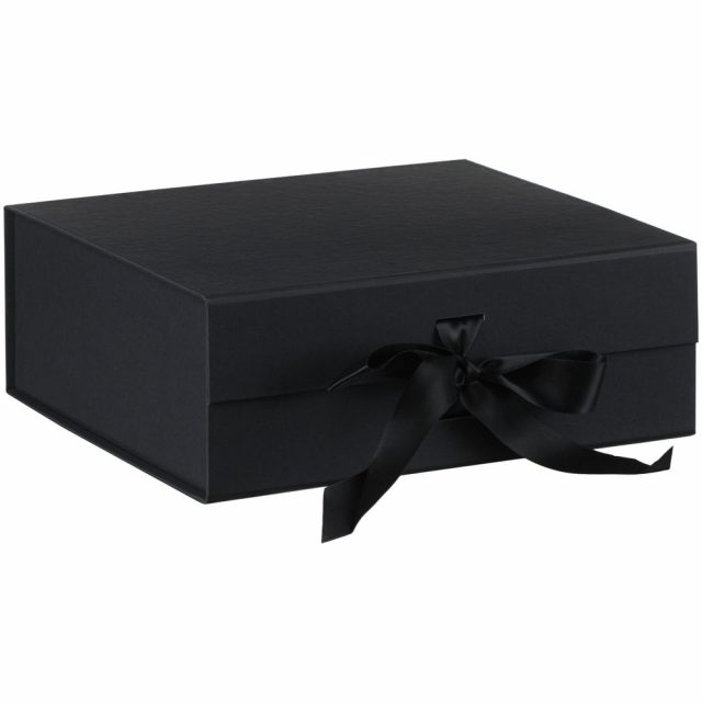 Коробка из переплетного картона, кашированного тонированной в массе крафтовой бумагой. Крышка на двух магнитах дополнительно фиксируется репсовой лентой.Толщина картона 2 мм.