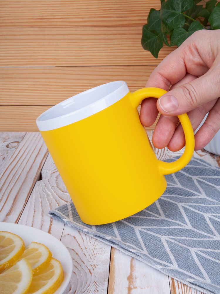 Кружка классической формы StopSpot привлекает внимание своим дизайном и покрытием. Яркая матовая поверхность выигрышно контрастирует с глянцевым белым ободком — так кружка выглядит необычно, а еще меньше пачкается во время эксплуатации.