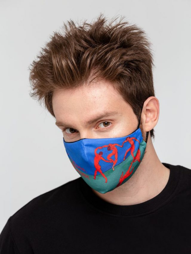 Принт создан по мотивам знаменитой картины Анри Матисса «Танец».Многоразовая маска из дышащей ложной сетки с ярким принтом с гигиенической хлопковой подкладкой и заушниками-резинками.