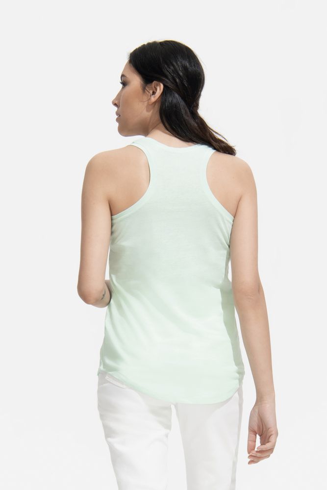 Женственная, приталенная и одновременно свободная модель. Закругленный низ изделия, глубокий вырез на спине («борцовская» спинка). Отделка выреза и пройм обтачкой из джерси. Тонкое джерси высшего качества, гребенной хлопок.