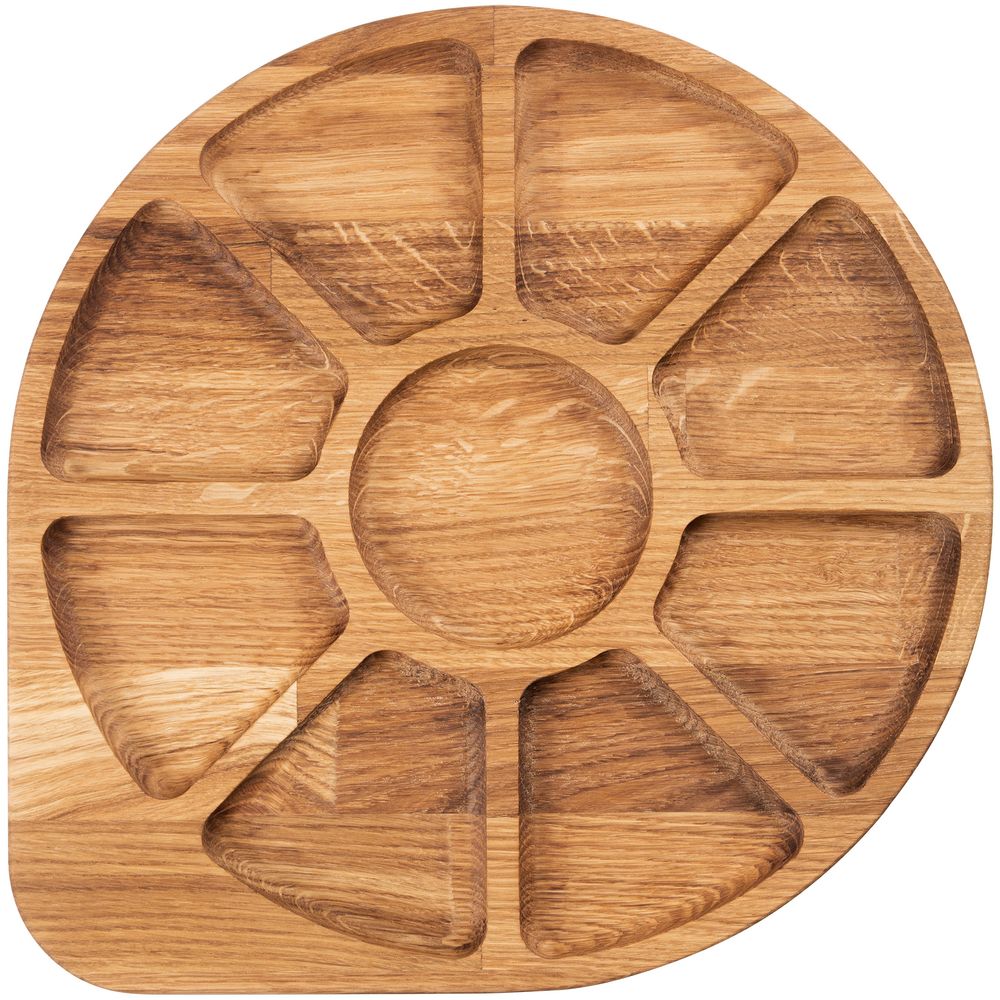 Стильная менажница — удобный аксессуар для сервировки закусок. Гостям можно одновременно подать до 9 разнообразных снеков, не занимая множеством мисочек и тарелочек целый стол.Деревянная круглая менажница предназначена для сервировки различных продуктов. Рекомендуется мыть после каждого использования, насухо вытирать и хранить в сухом месте.
