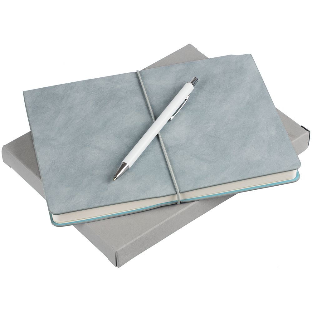 Ежедневник из искусственного материала, напоминающего замшу, и изящная ручка, которая удобно прячется за обложку ежедневника.