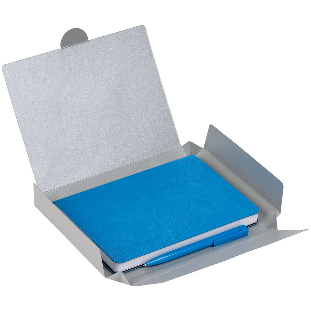 Недатированный ежедневник с гибкой обложкой из фактурного материала La Fite и металлическим шильдом на ляссе и ручка в тон, упакованные в подарочную коробку из дизайнерского картона.