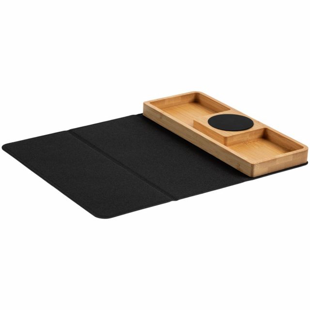 На пластиковом шильдике, под которым размещен сенсор зарядки, можно сделать гравировку логотипа, который будет эффектно светиться при подключении кабеля к источнику питания.Органайзер с ковриком для мышки и беспроводной зарядкой.