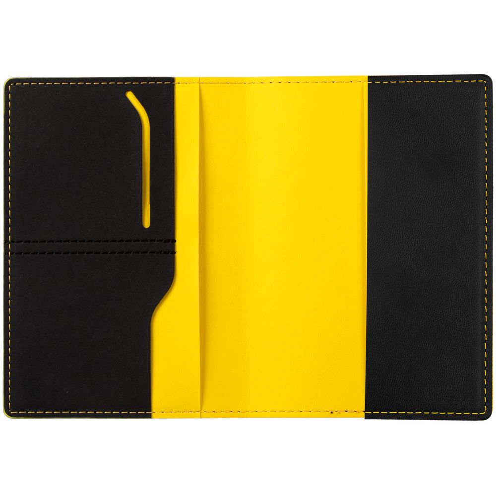 Имеет основное отделение для паспорта и 2 отделения для визиток или кредитных карт.
