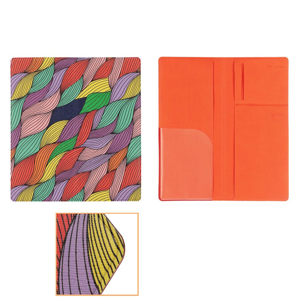Органайзер из искусственного материала, имитирующего сафьяновую кожу, имеет 5 отделений: для билетов, паспорта, визиток или кредитных карт.