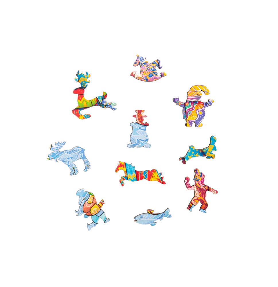 Вас ждут фигурки, связанные с зимними праздниками: вот мальчик бросает снежки, олени везут подарки, а Дед Мороз приветствует Новый год. Все вместе они складываются в яркий символ наступающего года, который непременно принесет удачу и счастье.