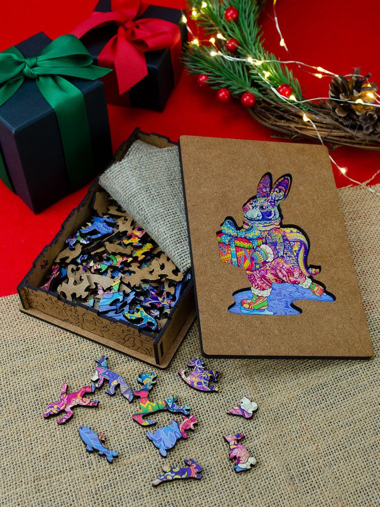 Упакован в деревянную подарочную коробку, которая послужит подсказкой с изображением во время сборки пазла, а затем легко станет частью праздничного интерьера.