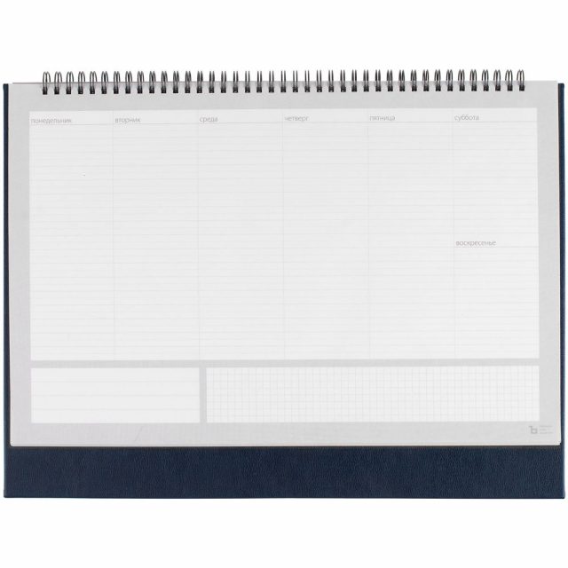 Настольный недатированный планер на открытой пружине. Обложка из белого мелованного картона, подложка из плотного картона в материале Petrus, тёмно-синий XX.