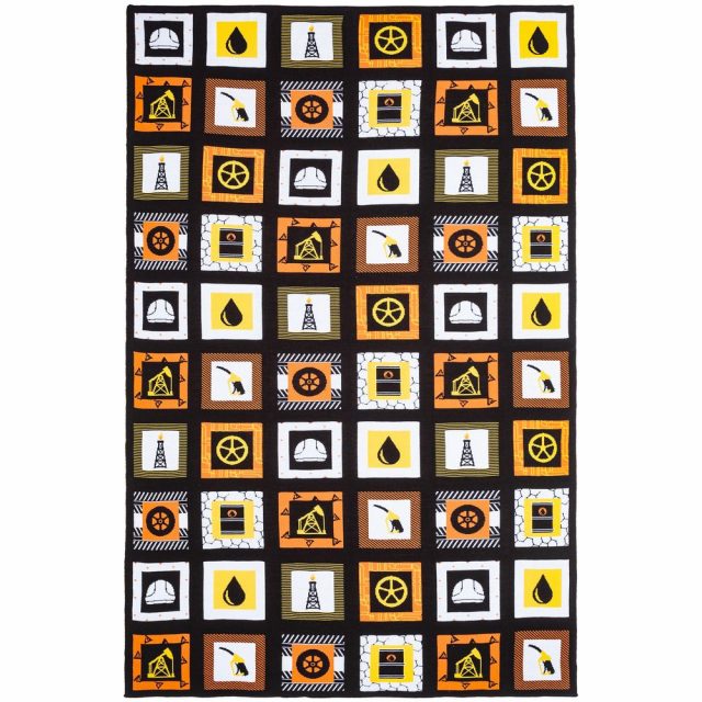 В каждой части общего рисунка, напоминающего лоскутное шитье, в самых теплых красках изображены главные символы нефтяной промышленности.
