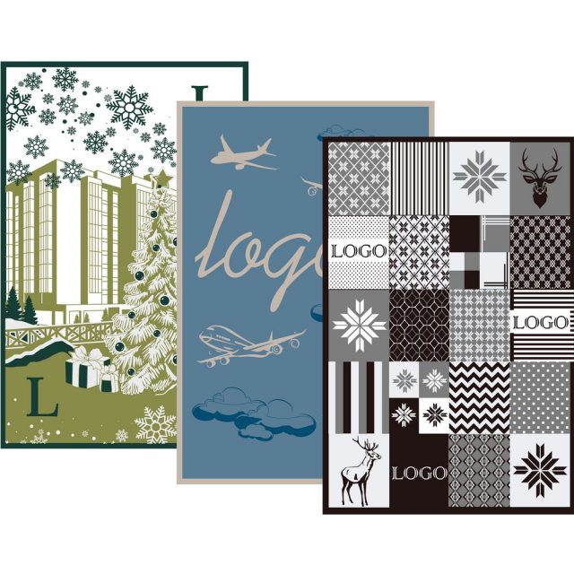 Плед с вывязанным логотипом и индивидуальным рисунком в фирменной цветовой гамме.