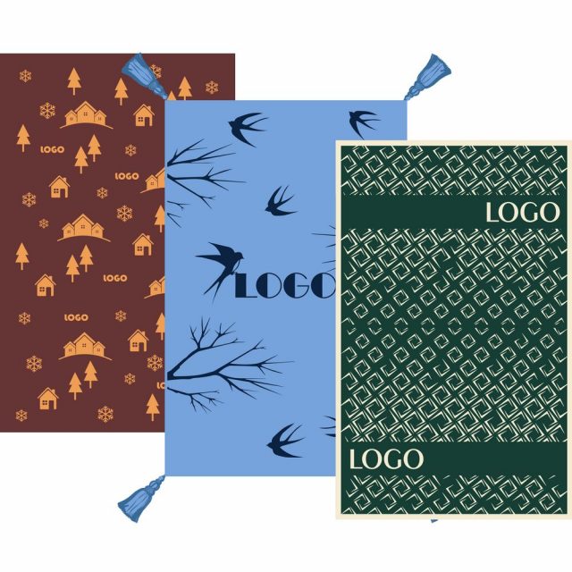 Плед с вывязанным логотипом и индивидуальным рисунком в фирменной цветовой гамме.