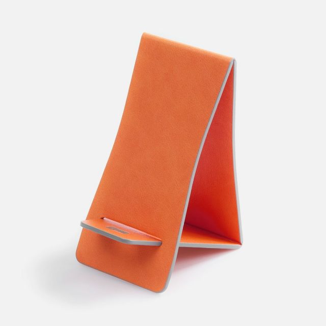 Складная подставка для телефона с вырубкой под шнур зарядного устройства. Выполнена из материала Petrus.